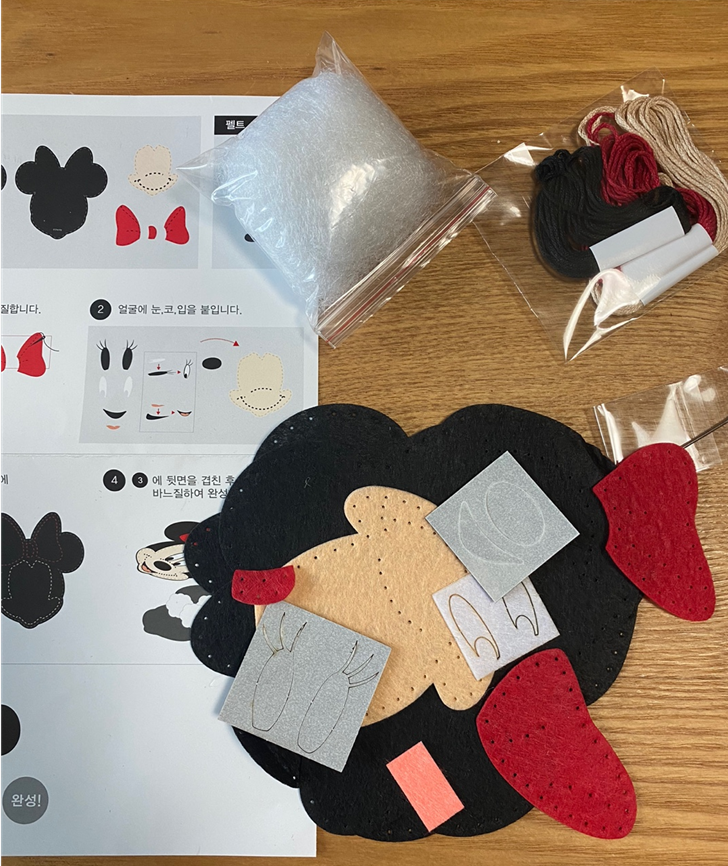 모양대로 잘린 부직포와 바늘, 실, 충전재인 솜?? 비스무리한 것이 있습니다