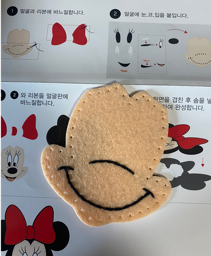 첫단계인 얼굴 부분에 입이랑 코 부분 바느질 해주기